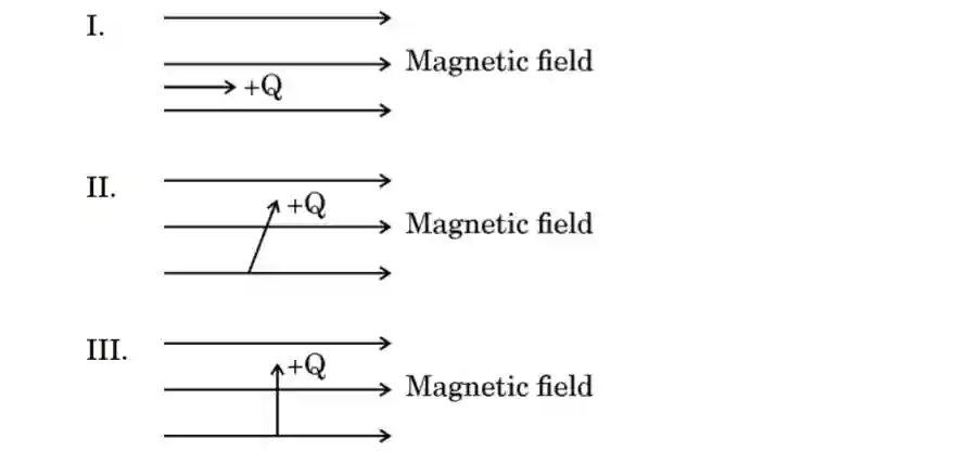 (b) Consider the following three diagrams in which the entry of a positive charge (+Q) in a magnetic field is shown. Identify giving reason the case in which the force experienced by the charge is (i) maximum, and (ii) minimum.