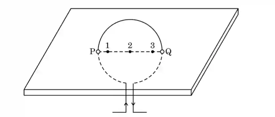❶. Consider a rectangular cardboard having two holes P and Q through which a current carrying circular loop has been inserted as shown in the diagram.