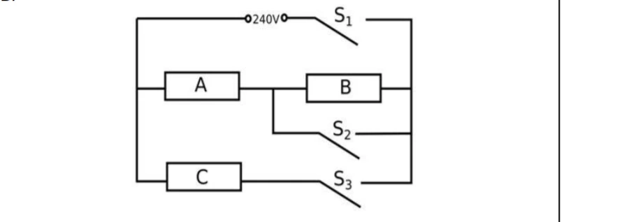 An electric heater consists of three similar heating elements A, B and C, connected as shown in the figure above. Each heating element is rated as 1.2 kW, 240 V and has constant resistance. S1, S2 and S3 are respective switches. The circuit is connected to a 240 V supply.
