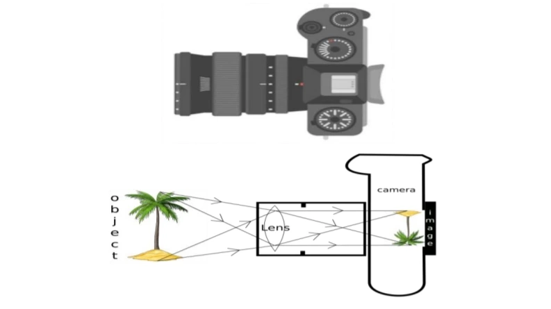 The above image is that of a Digital Single Lense Reflector (DSLR) Camera which are used to take high resolution photographs by professional photographers. The second image of the above two is a schematic diagram of how an image is formed on the sensor of the camera. Based on your understanding of the lenses, answer the following questions.